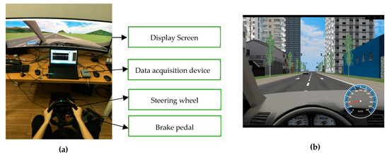 (a) Driving simulator-based experiment platform, (b) driving scenario.