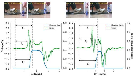Experiment 1: As shown in Figure 3, pictures of the foot from camera, digital signals from TENG and simulator were collected synchronously. Participants were asked to make actions on the brake/gas pedal according to the command. In this study, we used a tapping action to generate the command. The tapping action was also recorded by the camera. The time interval between the command time and the time when the signal has a significant change was defined as the “reaction time” of a sensor. Detailed information is listed as follows: