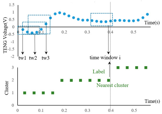 Feature selection: After the labeling stage, data from TENG were prepared for the classification. Firstly, we split the signal into time windows with the same width. For the stride of time windows, we set it to 1. Then the data from TENG were converted into time windows. Each time window was labelled by using the end point. The temporally nearest cluster result from the end point of time window was used as the label of each time window. The process of labelling is shown in Figure 4.