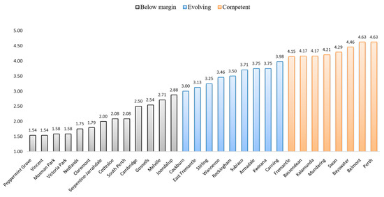 The analysis of the selected policy documents of the city councils in the PMR based on all 12 criteria across four principles revealed an average score of 3.09 (on a scale 1–5), which demonstrated an adoption, just above the minimum acceptable level, of the statewide road safety vision and incorporation of broader considerations. Around 43% of all councils scored below the minimum acceptable level, while another 30% could be classified under the evolving category (scoring between 3 and 4). Only a little over a quarter (27%) demonstrated highly satisfactory performance (scoring above 4) in capturing higher-level policy objectives in their local contexts. The Shire of Peppermint Grove and City of Vincent scored the lowest (1.54), while, on the other hand, the City of Belmont and City of Perth (CBD) yielded the highest average scores (4.63), considering all 12 criteria (Figure 2).