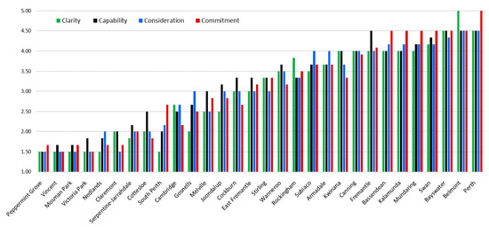Across the 12 criteria, over 40% of local governments performed poorly (with marginal scores below the minimum expected) in relation to clarity and community engagement (Figure 4b). Interestingly, in communication and partnership criteria under the community engagement principle, comparatively fewer councils received a competence score. Breaking the general trend, Belmont and Perth came across as high achievers with scores of 5—Belmont in clarity and Perth in its commitment to community engagement.