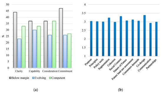 There was not much difference observed in overall average scores across all four principles—clarity, capability, change consideration, and commitment to community engagement (Figure 3). In comparative terms, however, capability scored higher (3.18) with a less dispersed variance (σ = 0.99) than other principles across all local governments. Belmont, Perth, and Bayswater stood out for demonstrating better clarity in terms of translating broader road safety strategies. A high percentage of councils (44%) performed poorly (below the minimum level) due to a lack of clarity in policy documents, while an even higher percentage (47%) of local governments performed just as poorly due to a lack of community engagement in road safety design and management (47%) (Figure 4a).