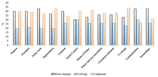 Further analysis of the 12 factors revealed that local government policies performed relatively better in aspects related to segmentation, social context, and co-design (Figure 4b). Meanwhile, the aspect that came across as the weakest in comparison to others related to the communication channel between the councils and the community. In the evolving category, the representation of the councils was observed to be consistently low (20–30%) across all criteria (Figure 5).