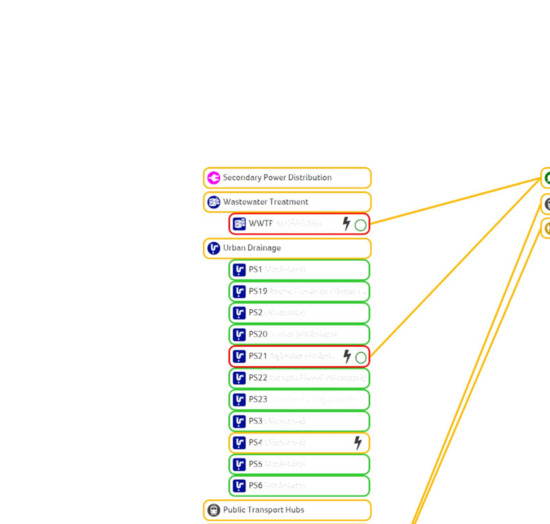 One advantage of making the analysis at the infrastructure level is the possibility of assessing its redundancies, i.e., cases where a given infrastructure can ensure the continuity of the service when another infrastructure fails. In Hazur®, the redundancies are established between infrastructures of the same service, although, in reality, redundancies can happen between different services and infrastructures of different services. For instance, if there is a subway service failure, the redundancy found by the users is to use a different transportation service, such as the bus. Moreover, some services can present internal redundancies, which are not necessarily between infrastructures. An example is the case when the waste collection is not possible at a given moment or a certain area, and the redundancy can be achieved by making the waste collection at a different shift or round. From the analysed services, redundancies were found in the power distribution substations, water distribution metering areas, water storage reservoirs, and subway power substations. Those redundancies rely on the network or grid organisation of these services’ infrastructures, granting them an important resilient characteristic.