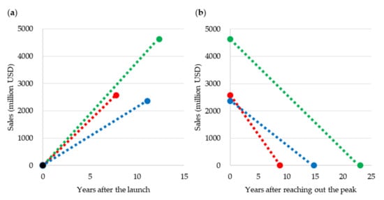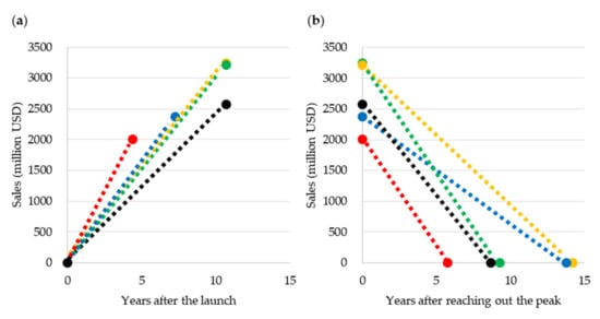 The four phases of the life cycle of drugs and products of other industries include introduction, growth, maturity, and decline [22]. We tried to keep the comparison simpler by devising an elaborate selection criteria of the study target to estimate the life cycle patterns when the growth process is relatively linear. For the introduction and growth phases, drugs whose sales did not reach 500 million USD in 2001 were considered. In this way, drugs launched before 2001 and approaching the maturity phase were excluded because the sales growth rate slows as the drug nears the maturity phase at which peak sales are attained. In terms of the maturity and decline phases, drugs whose sales peaked and then decreased were investigated. In these cases, the sales shifted from growth to decline from 2001 to 2016. We used a linear regression model to estimate life cycle patterns. For the sales growth rates in the introduction and growth phases, regression lines were computed by the least squares method for the period wherein the sales of individual drugs did not decline [23]. To establish the sales decline rates, regression lines were computed for individual drugs at the time when their sales did not exceed the peak [23].
