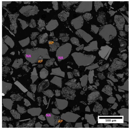 Typical SEM image of the recycled aggregate particles. Image size of 1024 × 1024 px (2710 × 2710 µm). The black background is the space between particles that are filled by epoxy resin, solid gray represents the natural aggregate (NA) particles, and the more heterogeneous gray zones are the attached cement paste (AP).