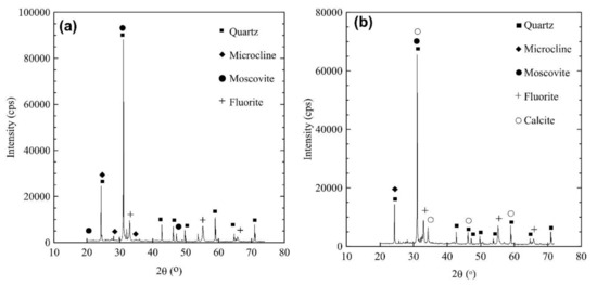 X-ray diffraction patterns of the aggregates are presented in Figure 3. The natural aggregate evaluation displays characteristic peaks of crystalline phases of quartz, microcline, muscovite, and fluorite minerals (see Figure 3a), while in the recycled aggregates, nearly the same minerals are found, in addition to calcite (see Figure 3b). The presence of calcite, i.e., calcium carbonate (CaCO3), evidences the occurrence of cement paste adhered to the recycled aggregate. It is possible to endorse that the recycled aggregate prevails from concrete structures due to the presence of about 12% of calcite; additionally, a very small content of kaolinite or hydrated aluminum silicate, i.e., a clay mineral, reveals some ceramic contamination. In general, the difference between both aggregates is emphasized by the presence of calcium carbonate.