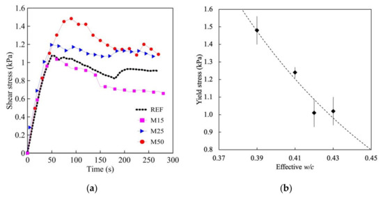 (a) typical shear stress vs. time curves of the four mortars obtained when shearing is applied at a low rotational velocity of 0.1 rpm; (b) the variations of yield stress responses with the effective w/c ratio for all mortars. The dashed line corresponds to an exponential approximation (R2 = 0.92), where = 79.3 and = 10.2 are fitting parameters.