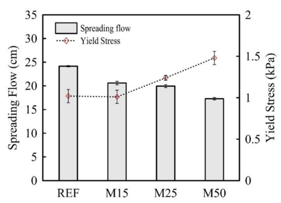 The calculated yield stress and the slump flow results are confronted in Figure 6. We observe the spreading flow values decreasing as the yield stress increases. This is expected since the replacement of natural by recycled aggregates was performed without compensating water. This means less free water remaining in the final mixture. In addition, the water demand of the higher porosity and absorption ratio of the recycled aggregates grows as the substitution rate of natural by recycled aggregates increases. These results are in accordance with previous studies (see, e.g., Duan et al. [11] and Jiang et al. [13]).