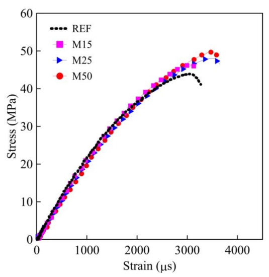 Figure 7 displays typical stress–strain curves for the mortars tested at 28 days. The linear elastic behavior remains nearly the same—ranging from 40 to 45% of the peak stress—for the reference mixture and the mortars M15 and M25. In contrast, the results of M50 show a linear elastic branch moving upwards to 52% of the total stress, although the statistical analysis confirms the absence of significant differences between the Young’s Modulus of all mortars. Interestingly, the inclusion of lightweight aggregates supposes to increase the linearity of the stress–strain curve since its Young’s modulus is lower than that of the rock aggregate and analogous to that of the mortar [46]. Strictly speaking, the presence of the attached cement paste covering the regular rock aggregate promotes rough and porous surface features, which seems to lightweight aggregates superficial characteristics. Nevertheless, let us emphasize that both the recycled concrete aggregate and the resulting mortars designed herein have different properties than regular lightweight aggregates and mortars themselves.