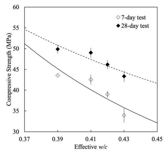 The 7- and 28-day compressive strength as a function of the effective w/c ratio of all mortars. The straight (R2 = 0.78) and dashed (R2 = 0.83) curves correspond to the approximation of Equation (2), where σ0 = 4.8 and γ = −2.4 are the parameters at 7 days, while at 28 days σ0 = 13.7 and γ = −1.4.