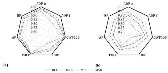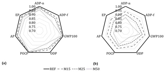 Increasing the substitution rate of aggregates improves the environmental performance at all environmental categories. The most considerable difference between M50 and the reference mixture occurred for the ODP and ADP-ff categories, reaching 14 and 13%, respectively, for the best scenario (smallest environmental impact for recycled aggregate treatment and highest avoided impact, considering the CPII-E40 cement). The differences also increase when normalizing the data by the compressive strength (Figure 9b and Figure 10b). This is related to the satisfactory environmental and mechanical performance of mortars with recycled aggregates that increase 22% for both environmental categories.