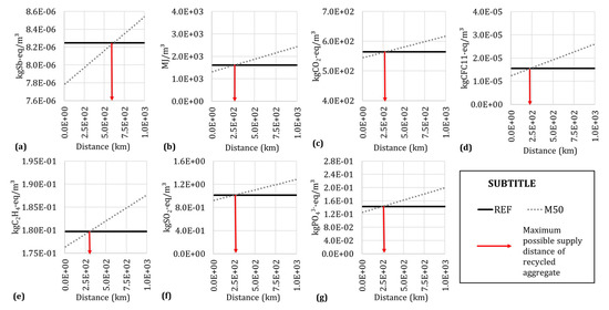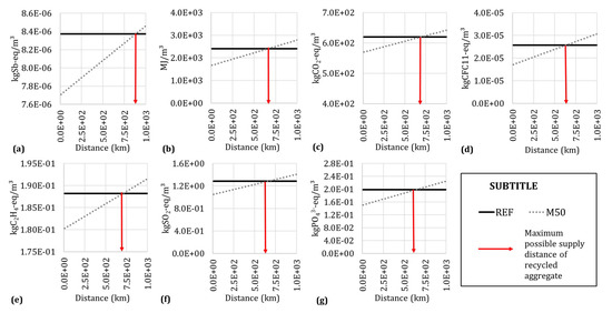 The influence of the delivery distance of the recycled aggregate considering the cement CPII and recycling with electricity for the best scenario (minimum transportation distances). (a) ADP-n—Abiotic Resource Depletion Potential for Nonfossil resources. (b) ADP-f—Abiotic Resource Depletion Potential for fossil resources. (c) GWP100—Global Warming Potential for a 100-year time frame. (d) ODP—Depletion Potential of the Ozone Layer. (e) POCP—Formation Potential of Tropospheric Ozone. (f) AP—Acidification Potential. (g) EP—Eutrophication Potential.