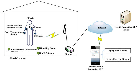 In the system, the three-subsystem server was constructed in the health promotion app server and integrated into one mobile phone application. Meanwhile, the relative sensors were set up to surround users or to be put on their body. Seniors can review their physiology data through the mobile phone app.