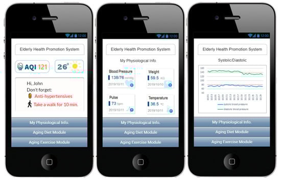 The system implementation was introduced as follows. The elderly health promotion system is designed for mobile equipment. In addition, we established a database to keep all measured data and provide to the user inquiring. When the system app records the elderly person’s data, it will determine whether the data exceed the normal range. Additionally, the records will transmit to the server to store into the MySQL database and are offered to managers or health caregivers. The back-end elderly health promotion system uses the Apache server and the MySQL database records and backs up the elderly’s information and physiological data.