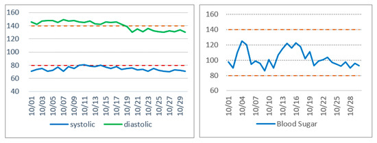 Moreover, the system management or caregiver who has authority to access the user’s information can review the elderly’s physiological data and the trend chart for the past month, as in Figure 3.