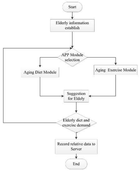 If the elderly has access to quality health care and improves their daily diet, this application can promote health and reduce the chance of becoming sick and bedridden. This study designed a health promotion application to provide an Aging Diet Module, designed it based on the elderly, and gave exclusive daily nutritional diet recommendations based on the relevant personal information of the elderly. In addition, the system also provided suggested exercise amounts to users through the Aging Exercise Module. This section is designed to be easy to use and easy to read. This function can be divided into two modules. The following is the app system flow chart (Figure 4).