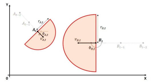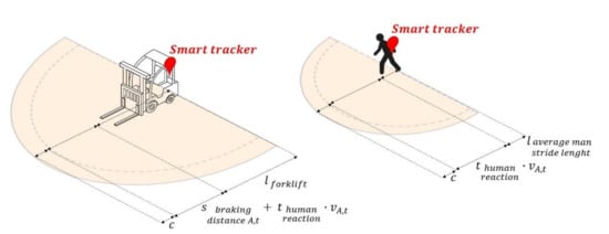A generic near miss occurs if two or more resources get so close that there is not enough stopping distance. Although a near miss does not always result in a collision—one of the resources may suddenly change direction to avoid the impact—it is still considered a risky event. Depending on the type of resource mapped by the tracker (pedestrian or forklift), a risk zone is calculated as a flat figure obtained from a closed semi-circle (red in Figure 1). In the case of resource A, this semi-circle will have a center given by Equation (1) and radius (4). When the closed semi-circumference of A intersects another closed semi-circumference (for example, that of B, Figure 1), the probability that A and B will collide in the following instants of time increases.