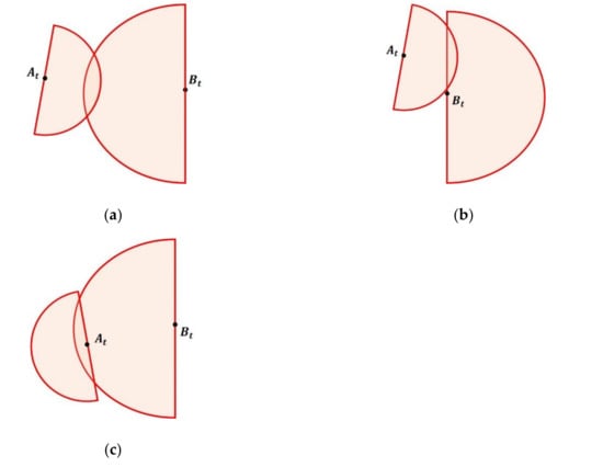 Before searching for the intersections between semi-circumferences of resources at instant t, it is useful to make an initial check to reduce the calculation power required by the methodology. In this perspective, we only search for pairs of points (A and B) whose Euclidean distance at instant t is less than or equal to the sum of the respective radii ( and ).