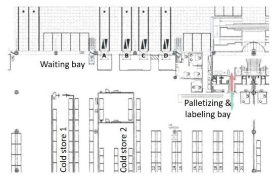 - h. Unloading of goods to be delivered by truck to the internal customer (production plant). Based on the production orders, the raw materials and semi-finished products needed to feed the production lines are shipped from the warehouse to the factory. Since the production plant has a small warehouse that can hold raw materials for only 4 h of work, this activity is repeated several times a day.