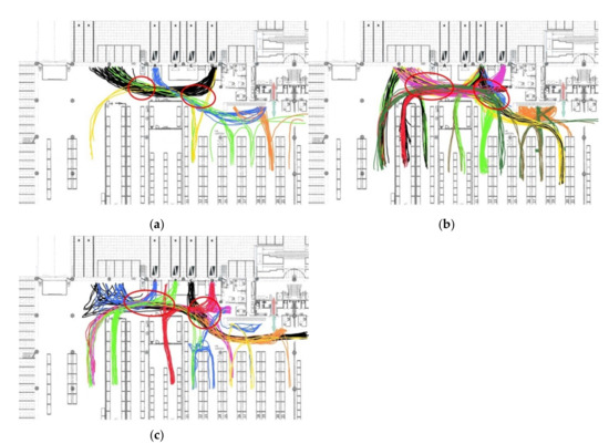 - The area in front of the discharge doors C and D (right circles, Figure 6a–c). This is where palletizing and labeling operations and most truck transports are carried out. Even in this area, forklifts and personnel remain to occupy space, increasing the probability of collisions.