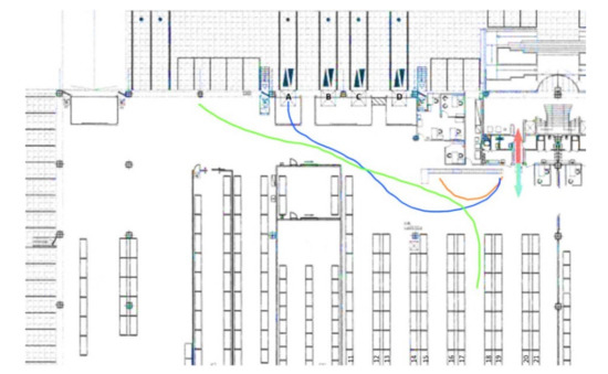 All operators and forklifts were equipped with smartphones. Then, their movements were observed. With the help of company IT technicians who installed a commercial app on their company phones [32] (see Section 2.1), following the suggestions by [7], smartphones worn by workers or placed on forklifts and their magnetic sensors were used to map flows. Three analyses were carried out—each lasting about 4 h—during which the devices recorded information on the flows. Different colors were used in tracing the spaghetti to distinguish the tracker IDs. Based on the flows recorded, a from-to-chart was created, of which an example is shown in Table 1. In order to associate with each flow path information related to the task performed, the focal points of the structure such as the labeling bay, the waiting bay, and the discharge doors (A, B, C, and D, Figure 5) were enclosed within rectangles. Then, the company’s IT technicians took information from the management systems regarding daily orders, scheduled activities, and the number of trips required to fill each truck. Subsequently, observing how many times the trackers were positioned within each focal rectangle and the duration of the movements, each route was associated with the task performed.