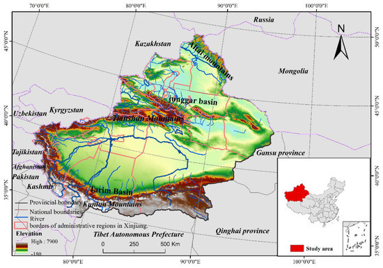 Xinjiang lies in the northwest of China (Figure 1), locating between 34°25′~49°10′ north latitude and 73°40′~96°23′ east longitude. The land accounts for about one sixth of China’s land. The maximum width between north and south of Xinjiang is 1650 km, and the maximum length between west and east of Xinjiang is 2000 km. It is the largest province in China, with a total of 1.66 million km2. Because of the large territory, the climatic conditions in Xinjiang vary greatly. Average annual temperature in Xinjiang is 9.7 °C, and among them, the average annual temperature in northern Xinjiang is 7.4 °C, while it is 12.4 °C in southern Xinjiang. Average annual precipitation in Xinjiang is 168.5 mm, and among them, the average annual precipitation in northern Xinjiang is 238.1 mm, while it is 95.8 mm in southern Xinjiang. The southeast of the study is connected with Gansu, Qinghai, and Tibet, while the northwest is adjacent to Mongolia, the southwest is adjacent to Afghanistan, Pakistan, and India, and the west is bordering Russia, Kazakhstan, Kyrgyzstan, and Tajikistan. Xinjiang is far away from the ocean with mountains and basins whose topography and geomorphology can be summarized as “Two Basins Surrounded by Three Mountains”. From north to south, the representative mountains are Mount Altai, Mount Tian, and Mount Kunlun. Mount Tian lies in the center, which divides Xinjiang into two parts: Junggar Basin in the north and Tarim Basin in the south. Among them, the Tarim Basin is the largest basin in China, with an area of 530,000 square kilometers.
