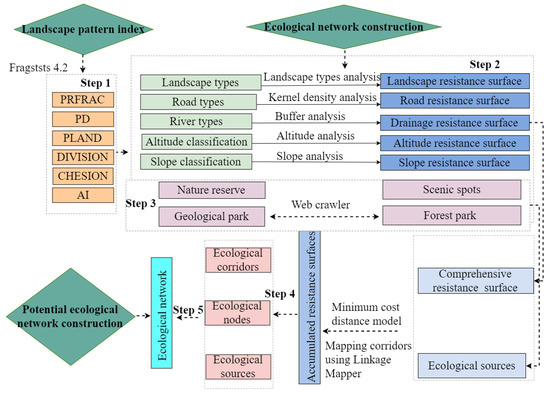 At present, the ecological network is mainly constructed by combining ecological corridor software with the ecological landscape model. Taking Wuhan for example, Tang et al. [25] constructed an integrated ecological network of birds and small terrestrial mammals, using the Integrated Valuation of Environmental Services and Tradeoffs (InVEST) and the least cost path model (LCP), combined with the cost surface affected by habitat element, geophysical landscape, and human disturbance. Shi et al. [26] used Graphab software to establish an ecological network based on global landscape heterogeneity analysis. In the construction of the ecological network, the identification of ecological sources and the determination of resistance surface, they utilized Morphological Spatial Pattern Analysis (MSPA) and Structural Equation Model (SEM). Li et al. [27] used FRAGSTATS 3.3 software, combined with the actual situation of the case and network analysis method, to construct the ecological network of the two sides of the river and the north and south of Nanchang City, China. Zhao et al. [28] took Tianjin, China as an example, based on the landscape pattern analysis, constructed the Tianjin urban ecological network by using the minimum cost distance model. The results show that the optimized Tianjin urban ecological network greatly improves the connectivity of urban corridors.