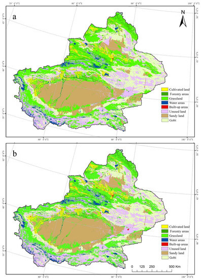 Xinjiang land use classification 2000–2015. (a) represents 2000, (b) represents 2015.