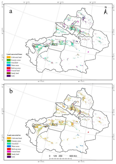 Transfer out (a) and transfer in (b) changes of land use/cover in Xinjiang from 2000 to 2015.