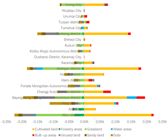 At city level, the cultivated land presents a significant increasing trend from 2000 to 2015 in most of the cities (Figure 5). Nevertheless, the cultivated land change in Wujiaqu, Urumqi, Shihezi, and Karamay Dushanzi is slight. The cultivated land expansion in Aksu, Kashi, Tacheng, Bayinguleng Mongolia Autonomous district, and Yining are as high as 0.21%, 0.17%, 0.14%, 0.14%, and 0.06%, respectively. Built-up areas have increased in each city district of Xinjiang, and the areas with rapid increase are Bayinguleng Mongolia Autonomous district and Changji District, with a change rate of 0.03% and 0.02%, respectively. The change rate of Hami, Urumqi, Turpan, Tacheng, Yining, and Kashar is the same, with an increase of 0.01%.
