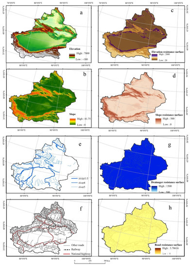 Distribution of landscape elements and corresponding resistance surfaces at all levels in Xinjiang (a,b,e,f) represent the elements of elevation, slope, drainage, and road, respectively; figure (c,d,g,h) represent the elevation resistance surface, slope resistance surface, drainage resistance surface, and road resistance surface, respectively.