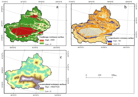 Landscape resistance surface (a), comprehensive resistance surface (b), and accumulated resistance surface (c) in Xinjiang.
