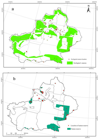 Distribution of ecological sources (a) and nature reserves (b) in Xinjiang.