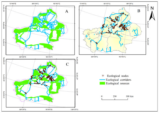 Spatial distribution of potential ecological corridors (A), ecological nodes (B), and ecological sources (C) in Xinjiang.