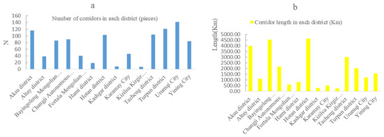 District statistics of the ecological corridor in Xinjiang. (a) represents the number of ecological corridors, and (b) represents the length of ecological corridors).