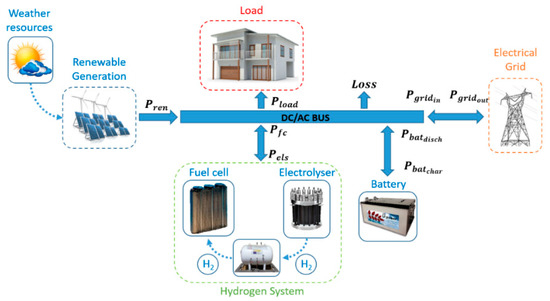 General architecture and power balance of a renewable source-based microgrid with hydrogen as backup.