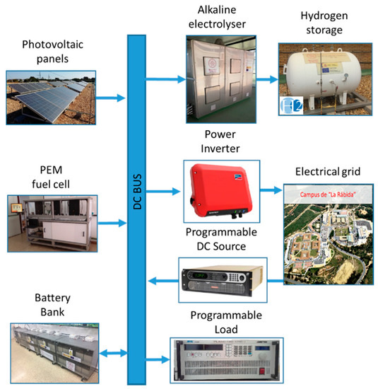 The renewable source-based microgrid with hydrogen as backup used in this paper is implemented at the University of Huelva and is shown in Figure 3.