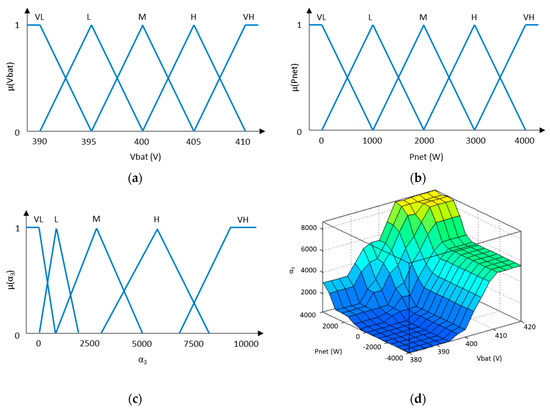 (a) Battery bank voltage membership functions. (b) Microgrid net power membership functions. (c) Weighting factor α3 membership functions. (d) Fuzzy controller output surface.