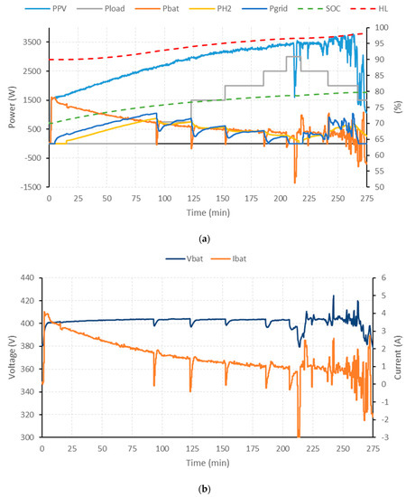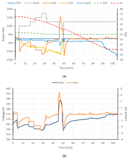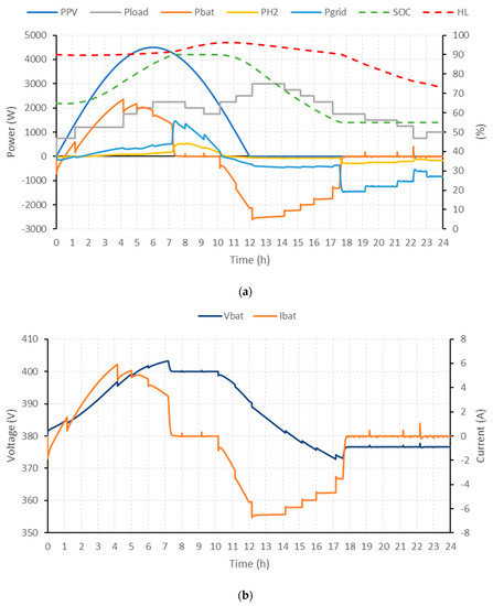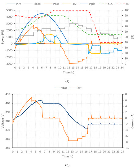 The limit values SOCmin, SOCmax, HLmin, HLmax, Vbatmin and Vbatmax are associated with the minimum and maximum operating values defined by the safe operating margins of batteries and hydrogen-based storage systems. On the other hand, restrictions on operating powers are defined as the maximum power values (Pbat, PH2 and Pgrid) and variation in the power setpoint (ΔPbat, ΔPH2 and ΔPgrid) according to the sign criteria (the criterion defined regarding Figure 1, following the state-space discrete model (1) was that the delivered power had to be negative and the consumed power positive): In the case of batteries, the minimum and maximum value will be given by the maximum charging and discharging powers of the battery bank (, and , respectively), for the hydrogen system, the minimum and maximum value will be given by the nominal powers of the fuel cell and electrolyzer (Pmaxfc, ΔPmaxfc and Pmaxels, ΔPmaxels, respectively) and related to the use of the electricity grid, the minimum and maximum value will be given by the maximum values for the purchase/sale of energy to the grid (, and , , respectively).