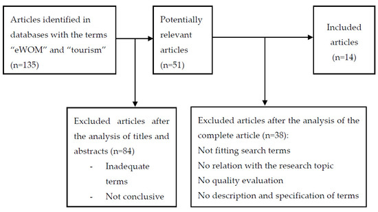 The scientific databases of Scopus, PubMed, PsyINFO, ScienceDirect, and Web of Science were searched to collect the scientific articles on the subject matter. Following Banerjee et al. [27], we used a randomized controlled process to select the databases using the search terms “tourism” and “eWOM”; the timeframe was set from 2010 to 2018. The database search yielded a total of 135 articles. The Boolean operator AND was applied to optimize the results. All articles were analyzed by first reading the titles and abstracts and then selecting potentially relevant articles that met our inclusion criteria—namely: the papers had to report conclusive results and use adequate terms. This filtering resulted in discarding 84 articles and retaining 51 potentially relevant articles. In the next stage of filtering, the articles had to pass a quality evaluation; that is, only peer-reviewed papers were retained. Other criteria at this stage were the availability of keywords or description terms, relation to the research topic, and appropriate search terms. Those papers that did not meet these criteria (n = 38) were removed, resulting in a total of 14 studies that were included in the final dataset. Further detail on the filtering process is provided PRISMA 2009 Flow diagram (see Figure 1). The filtering criteria were based on AMSTAR [28]. Although the AMSTAR tool was initially designed to assess the quality of the articles from their abstracts, in our review, we followed the indications of [29] as an eligibility gauge.