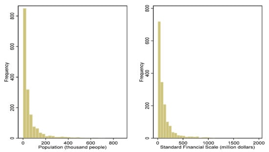 The size of the municipalities measured with a standard financial scale or by total population tend to have right-skewed distributions (Figure 1). The standard financial scale is the sum of the municipality’s standard tax revenue and ordinary local allocation tax by the national government [] (p. 23). This scale is an index of the size of a municipality’s budget, which indicates how much money they can use for their own purposes. This index rages from 2.75 to 1726.80 million dollars, with a mean of 135.61 million dollars. In addition, the total population in municipalities ranges from 160 to 892,535, with a mean of 60,257.32 persons. These indices imply that the size of the municipalities is widely dispersed, including a large number of small- and medium-scale municipalities and several large-scale municipalities.