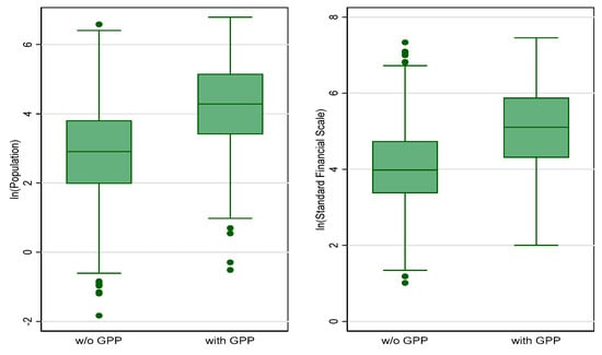 Finally, the right and left sides of Figure 2 show box plots of the natural log of standard financial scale and total population in municipalities with and without GPPs, respectively. Each box area implies between the 25th and 75th percentiles of each of the size indices, while an upper line implies an upper adjacent value, and a lower line implies a lower adjacent value. Moreover, the points outside of both the upper and lower lines indicate outliers. We can see that in terms of size, municipalities with GPPs tend to be larger than those without GPPs. However, the outliers in Figure 2 imply that several large-scale municipalities, such as Kagoshima City or Suginami district, have not adopted a GPP.