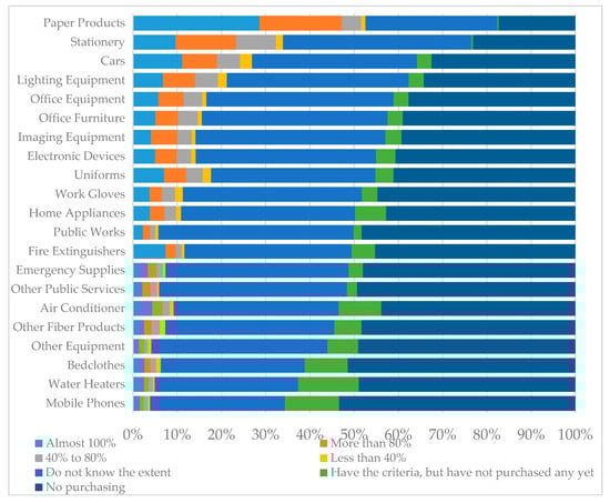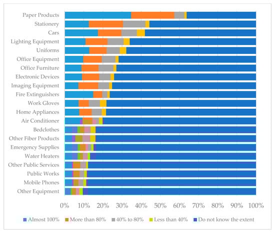 As we can see from Figure 3, there are many municipalities that have implemented green purchasing but do not measure their green purchasing rate, leaving us to wonder what percentage of municipalities that have implemented green purchasing do not measure their green purchasing rates and what percentage of municipalities have an almost 100% green purchasing rate? Figure 4 gives such information. The colors are the same as in Figure 3; for example, the blue areas represent the share of the municipalities whose green purchasing rate for the given category is almost 100%, and the blue, orange, gray, and yellow areas in Figure 4 jointly show the share of municipalities measuring their green purchasing rate for each category. The categories are sorted in descending order according to share. The average share across the categories is 24%. Thus, it is clear that many municipalities do not measure their purchasing rates.