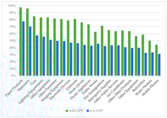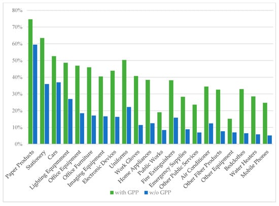 The difference is also small for paper products and cars, which has two possible explanations. The first possible explanation is that the criteria for green products for these items are clear; hence, a GPP is not needed to purchase them. Another possible reason is that municipalities do not frequently purchase cars, and hence, it is easier for them to measure their own green purchasing rate. Figure 6 shows that for work gloves, office furniture and uniforms, the measurement rates are low for municipalities without a GPP. We notice that these three items have small environmental impacts, or, at least, they seem to. Consequently, procurement personnel in municipalities without a GPP may not bother to measure the green purchasing rate of these categories.