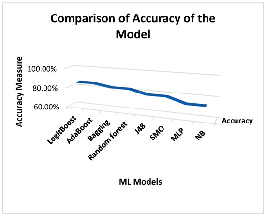 Values for accuracy of LogitBoost–RF and AdaBoost–RF are the same. Figure 2 illustrates the overall comparative evaluation of the accuracy of each model and boosted RF.