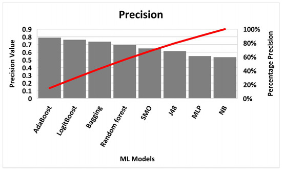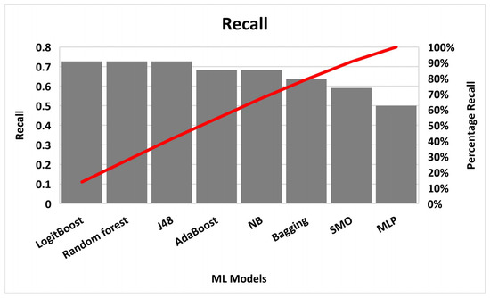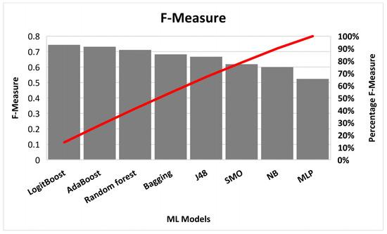 Pareto charts are composed of bar and line graphs [49]. The left vertical axis is a measure of the parameter value precision, recall, or f-measure. The right vertical axis depicts the cumulative percentage of the total value of the parameter. The horizontal axis represents the respective model. The Pareto chart highlights the prominent algorithm for the corresponding evaluation. Results are promising by boosting the RF. Both practices, LogitBoost and AdaBoost, enhanced the prediction capability of RF. Pareto charts in Figure 3, Figure 4 and Figure 5 enlighten the perception of precision, recall, and f-measure, respectively.