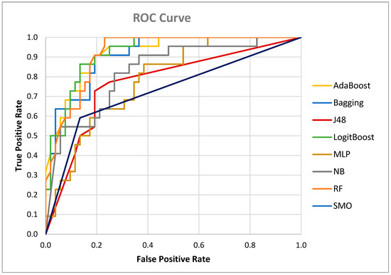 The ROC area represents the area under the ROC curve. Interpretation of the ROC area according to the proportions given in Table 1 of Section 3 demonstrates the exceptional performance of LogitBoost among other competing algorithms. Therefore, boosting the RF provided a substantial boost to the accuracy of predicted outcomes. Figure 6 illustrates an ROC curve to visualize the ROC area and performance of all models.