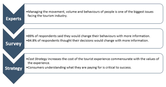 Findings from this research suggest that residual goodwill and willingness on the behalf of the visitor to behave more sustainably is not being translated to actual behaviours at tourist sites. There is disconnect between human behaviours in their ordinary habitat (home) versus when they are visiting, and this is synonymous with the idea of the holiday, which presents an escape from ordinary behaviours and values [46]. Future research will need to be done on assessing how the survey results would translate into the actual tourist environment. The results of this paper show the willingness on behalf of the visitor and the industry to improve on sustainable behaviour and responsible decision making; however, observing these intentions in practice was outside the research boundaries and further study on this will help understanding of where the pressure points in successfully changing behaviours lie.