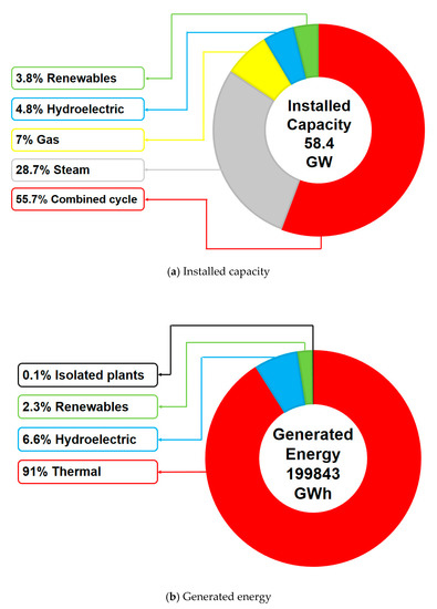 Although Egypt is rich in various renewable energy sources, these sources have not been optimally exploited yet [29]. Most of the generated electricity in Egypt is thermally produced from either gas, steam or combined cycle. Another source of electricity in Egypt is hydroelectric power derived by exploiting the energy of falling water through the river Nile dams. Figure 1 shows the renewable energy contribution compared to other electricity sources in the Egyptian electricity market in the fiscal year 2018–2019. The percentage of the installed capacity of renewable resources to the total electrical installed capacity in Egypt does not exceed 3.8%. The percentage of generated renewable energy to the total generated energy in Egypt also does not exceed 2.3%.